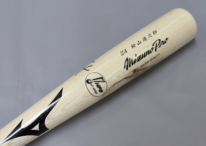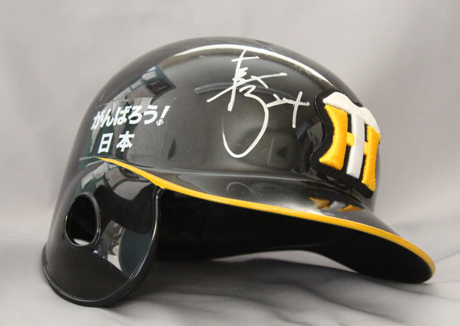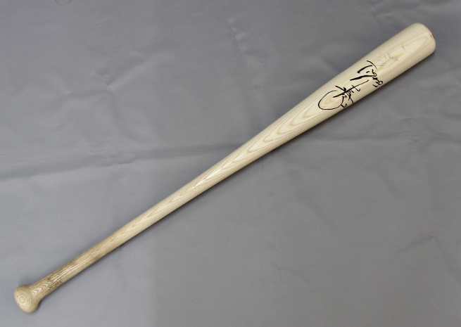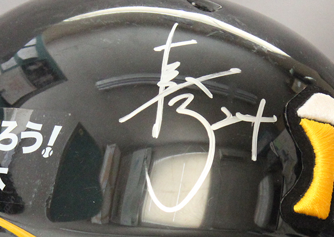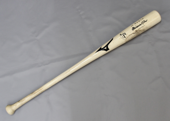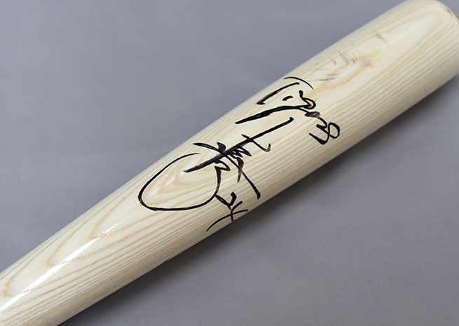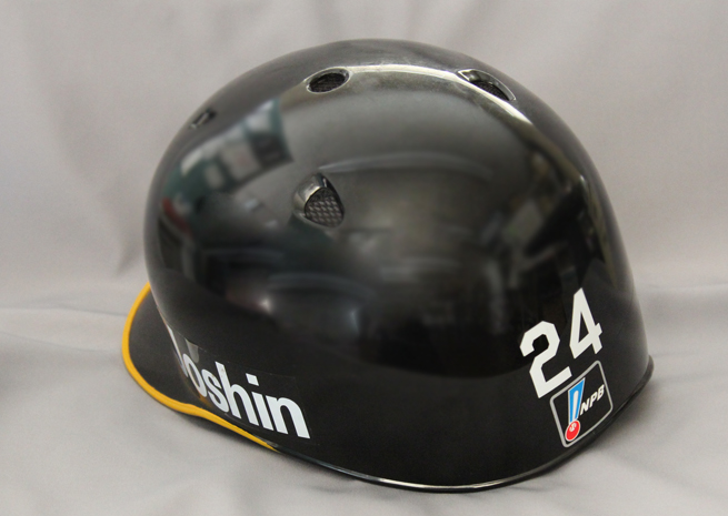 今回は2013年使用の試合用バットと、2013年使用のつばが黒色で黄色の縁取りのホームヘルメットです。フォーカスライトで管理する使用済みバットは最後の1本となりました。