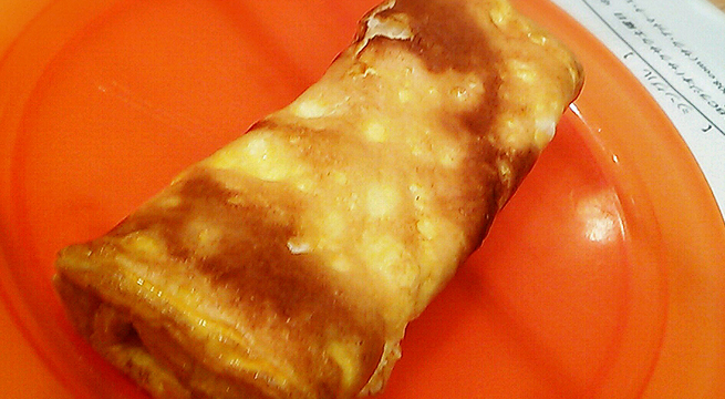 僕の作る玉子焼きは、ゴマ油で香り付けをして、ソースをかけて食べる、中華風味の玉子焼きです。